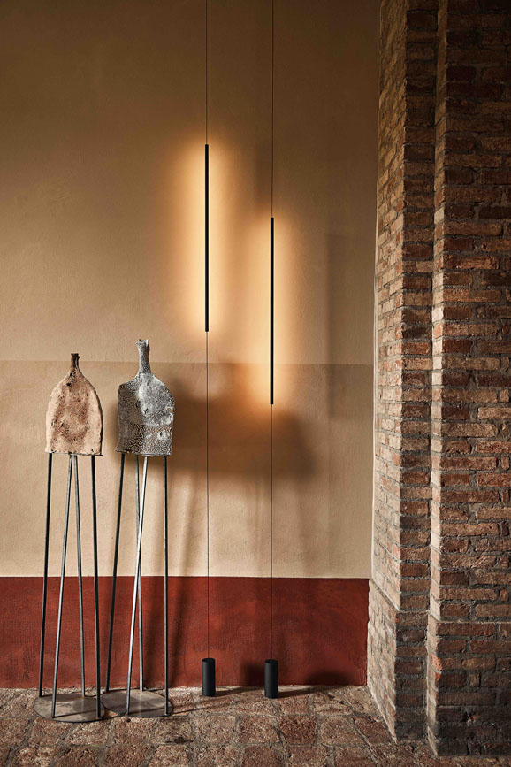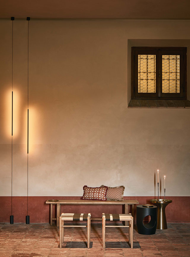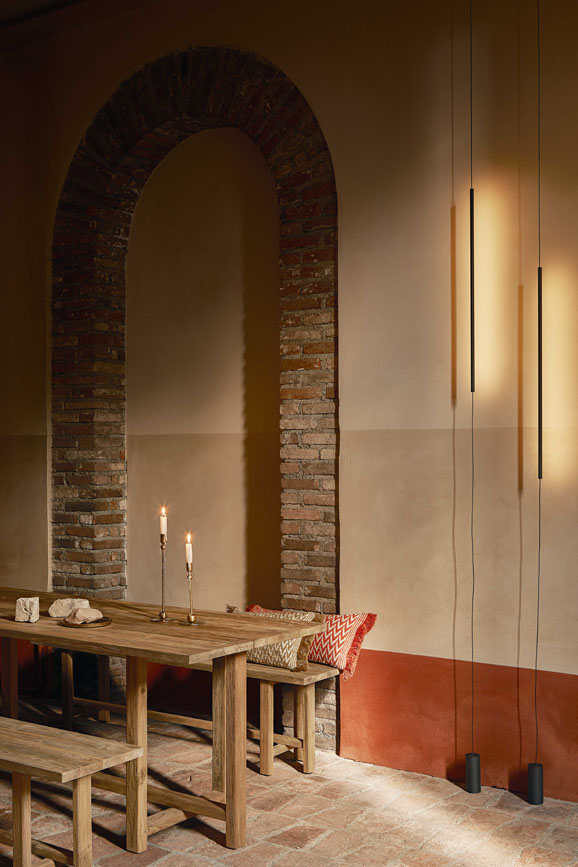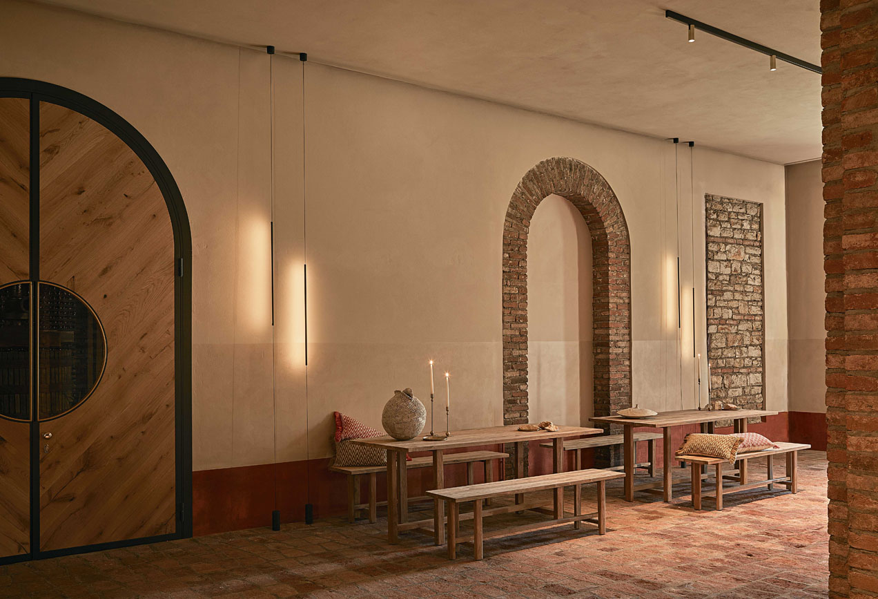 Il punto focale dell’atmosfera è affidato alla luce, protagonista di un racconto quasi magico: abbiamo studiato un’illuminazione puntuale che, nell’oscurità della cantina, ricorda il risalire leggero del perlage nei calici. Piccoli punti luminosi vibrano nello spazio, disegnando ombre lunghe che enfatizzano le prospettive delle botti e guidano lo sguardo in un percorso ipnotico.