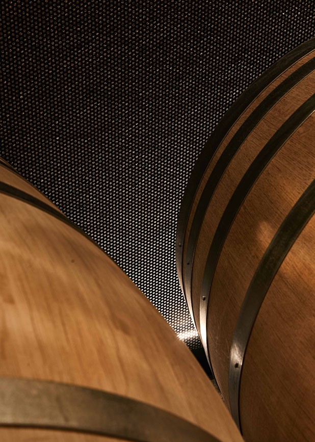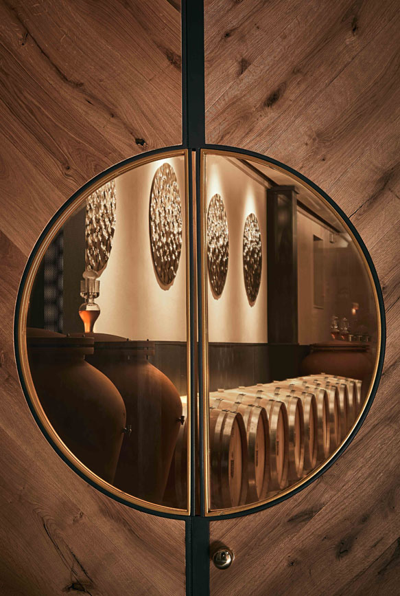 Dal soffitto la luce riverbera sui dischi in metallo alle pareti ottenendo riflessi dorati su botti e pavimento.
