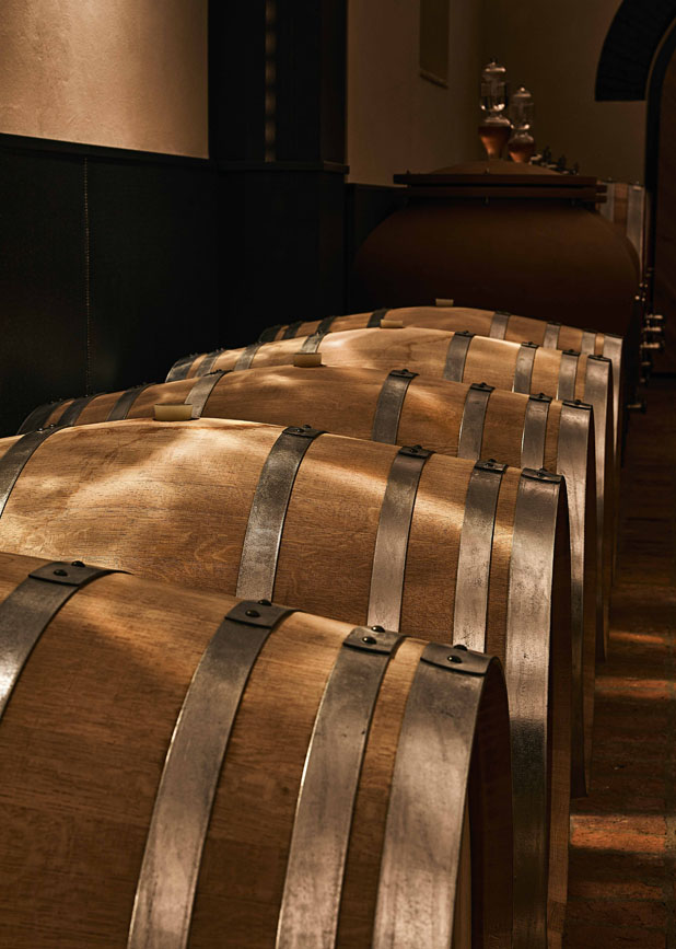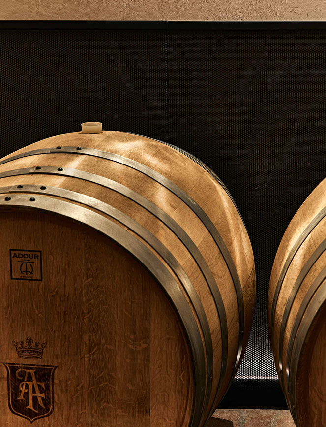 Abbiamo voluto creare un vero tempio per il riposo del vino. Le strutture, dalle linee nette e decise, tagliano l’oscurità con eleganza, sorreggendo le barrique come tesori in esposizione. In questo spazio, il minimalismo non fredda l’ambiente, ma ne definisce i confini, lasciando che l’umidità, il profumo del rovere e la memoria delle volte in mattoni rimangano i veri protagonisti.