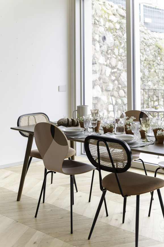 La tavola come racconto: Non è solo un arredo, ma un’installazione di ricordi. I piatti fioriti dal sapore d’altri tempi convivono con le sedute in paglia di Vienna e le linee contemporanee delle sedie bicolore, in un mix tanto semplice quanto ricercato.