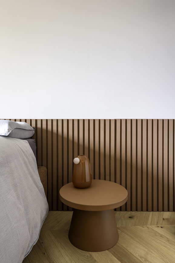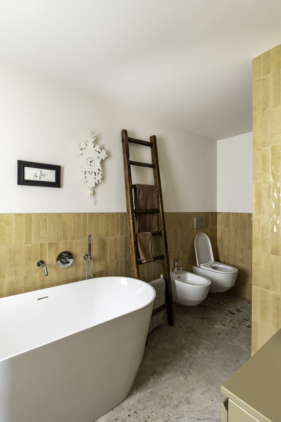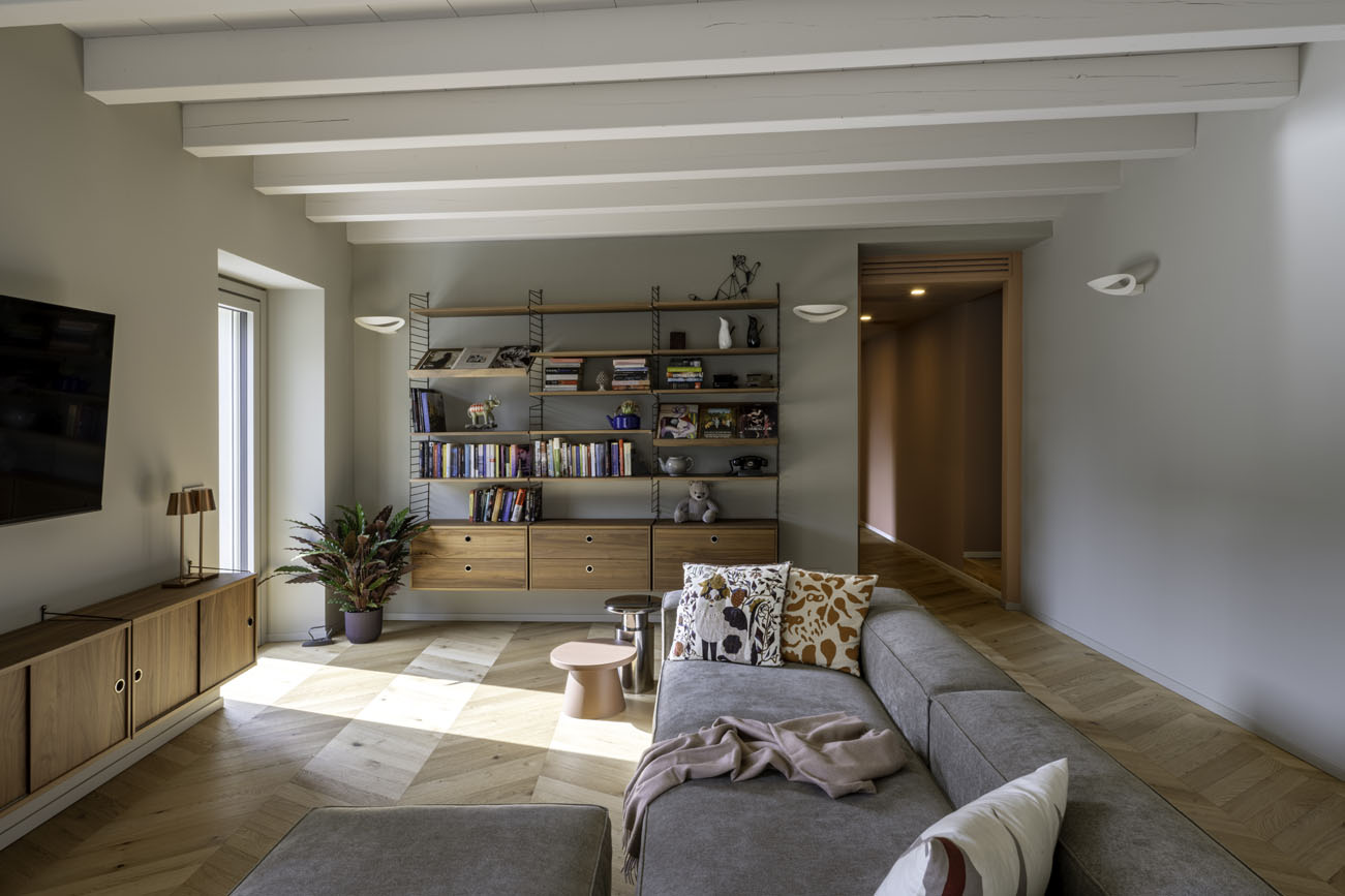 Il soggiorno si trasforma in luogo del relax, con to i più scuri e matericità intense, come il noce canaletto sulle librerie in stile nordico. Un comodo divano e le tonalità del grigio che si mescolano a quelle del legno, grande impatto ha il contrasto in terracotta che ci accompagna in corridoio per poi entrare nella zona notte e nel bagno padronale.