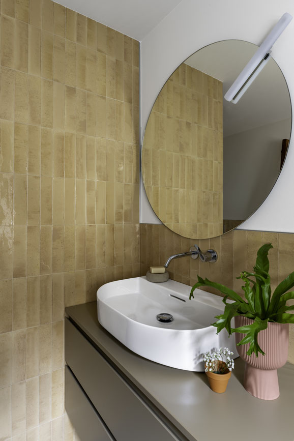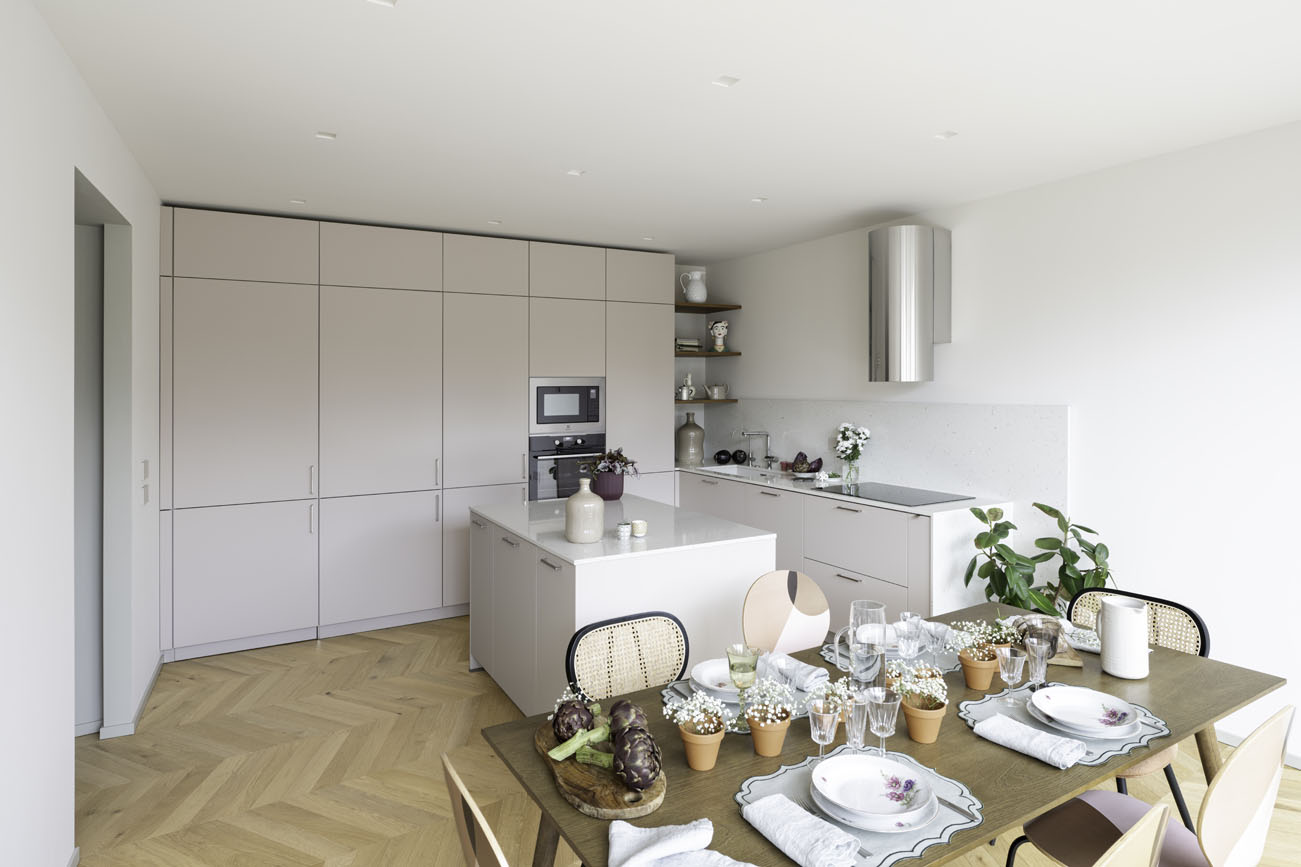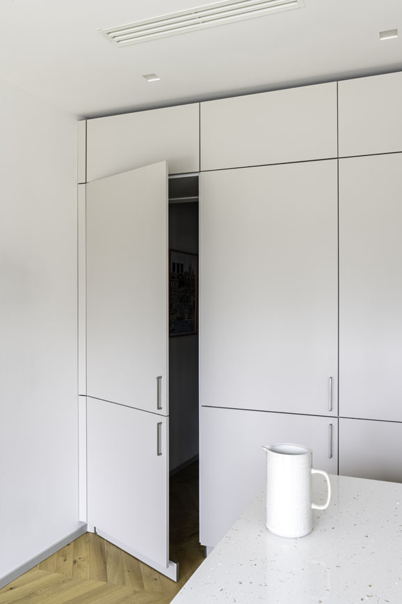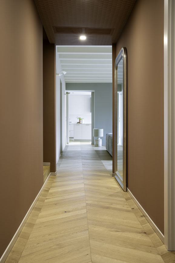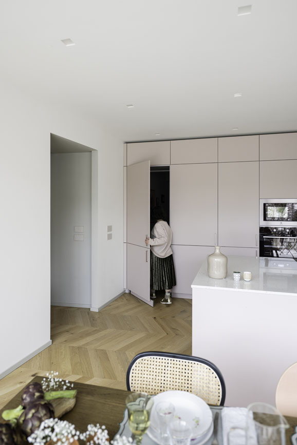 Il cuore dell’intervento è la zona cucina: un volume neutro dalle linee pulitissime che sembra quasi svanire nelle pareti, nascondendo al suo interno una passaggio “segreto” che organizza la vita domestica, verso la lavanderia, con eleganza. Qui, il pavimento in legno a spina aggiunge una nota classica e sofisticata, creando una base calda su cui poggia l’area dining.