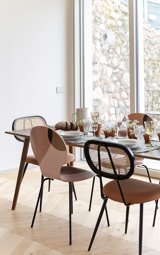La tavola come racconto: Non è solo un arredo, ma un’installazione di ricordi. I piatti fioriti dal sapore d’altri tempi convivono con le sedute in paglia di Vienna e le linee contemporanee delle sedie bicolore, in un mix tanto semplice quanto ricercato.